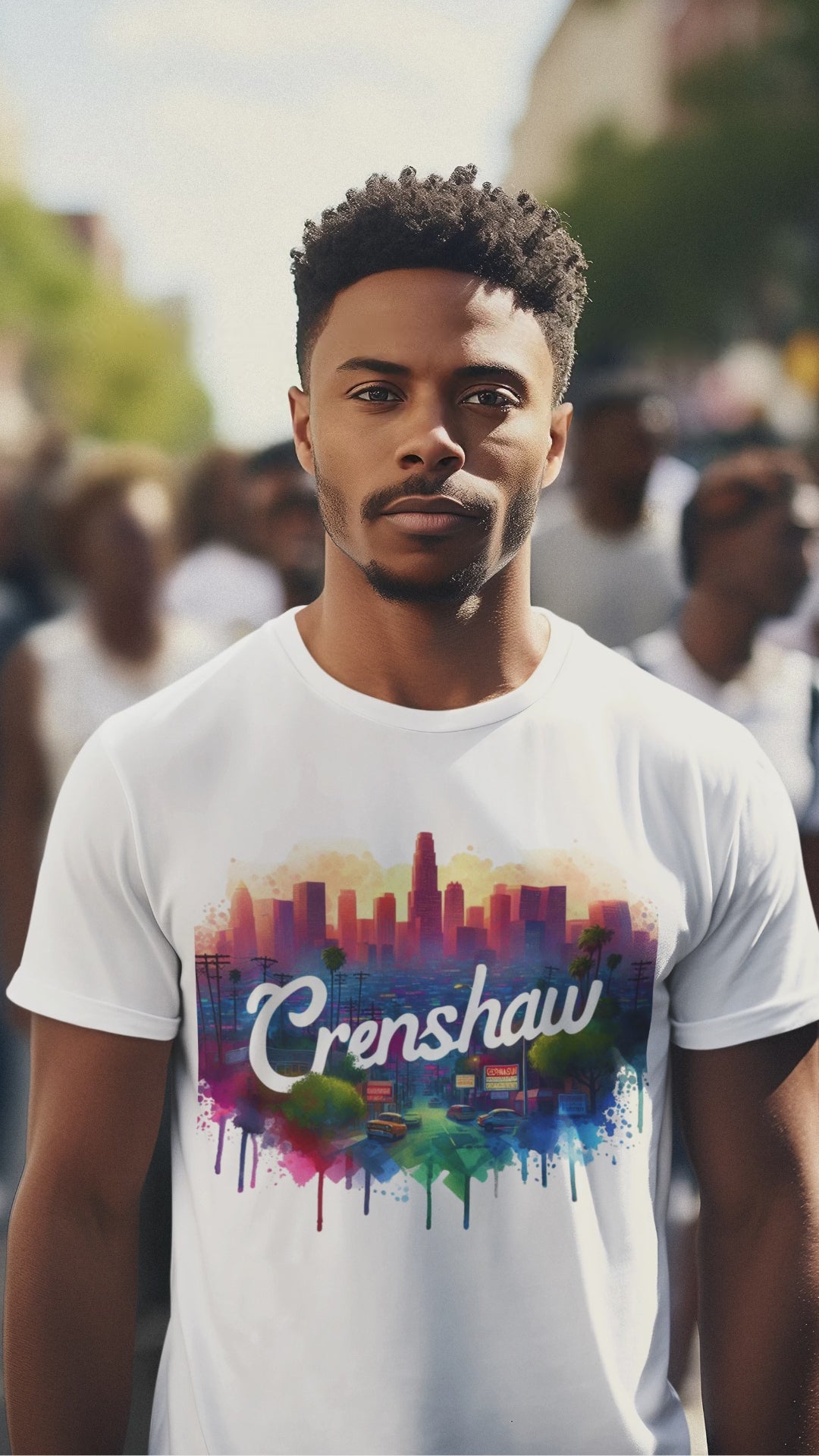 This CRENSHAW ONE classic unisex jersey short sleeve tee fits like a well-loved back in the day favorite. Soft cotton and quality print make users fall in love with it over and over again. These African American pride t-shirts have-ribbed knit collars to bolster shaping. The shoulders are tapered for a better fit over time. Dual side seams hold the historic Black neighborhood garment's shape for longer.
