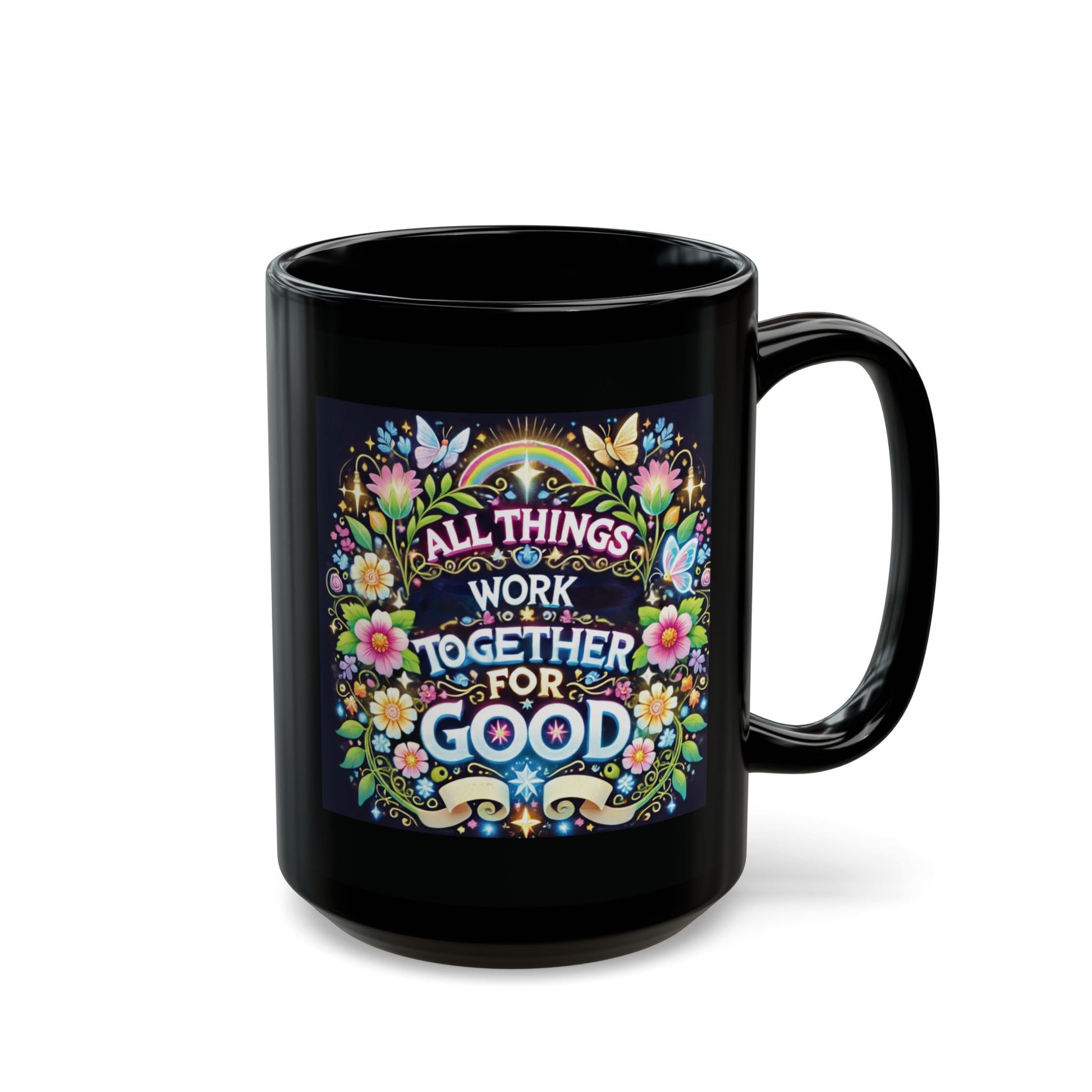 This inspirational black ceramic mug features the scripture verse 'ALL THINGS WORK TOGETHER FOR GOOD'. With vibrant colors and a glossy finish, this mug is perfect for coffee lovers looking for a faith-filled start to their day. Suitable for microwave and dishwasher use, this mug is a practical and stylish addition to anyone's kitchen. Ideal for those seeking daily encouragement and inspiration.